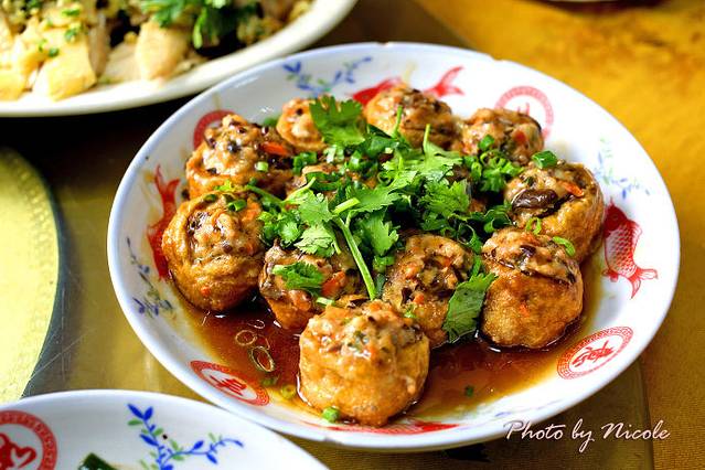 酿豆腐,这个最抢手,不仅看着漂亮,吃起来也滋味足,转了两圈盘子就见底了。