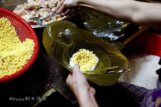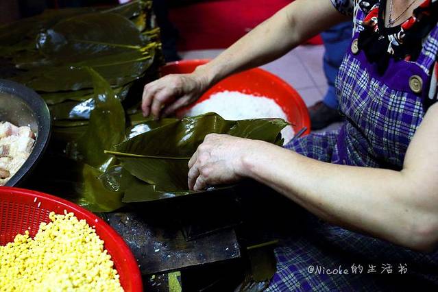 视觉渐渐恢复之后,环顾四周,发现这小小的屋子里似乎到处都是粽子,显得有些拥挤。这里只卖两种粽子,这些堆在架子上的是碱水粽,里面是甜甜的豆沙馅,而阿姨手里正在包的就是著名的裹蒸了。