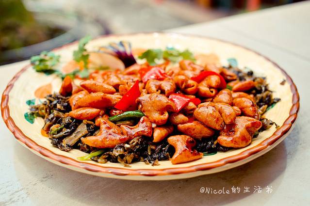 农家猪的肉吃起来确实与平时在市场买的不一样,肉味更香。这个炒猪杂的做法貌似在这里很流行,因为晚上也吃到了,后面再说。