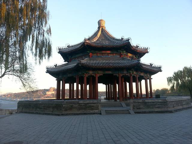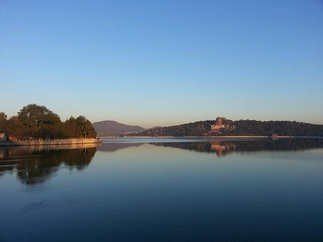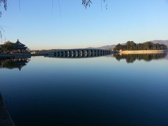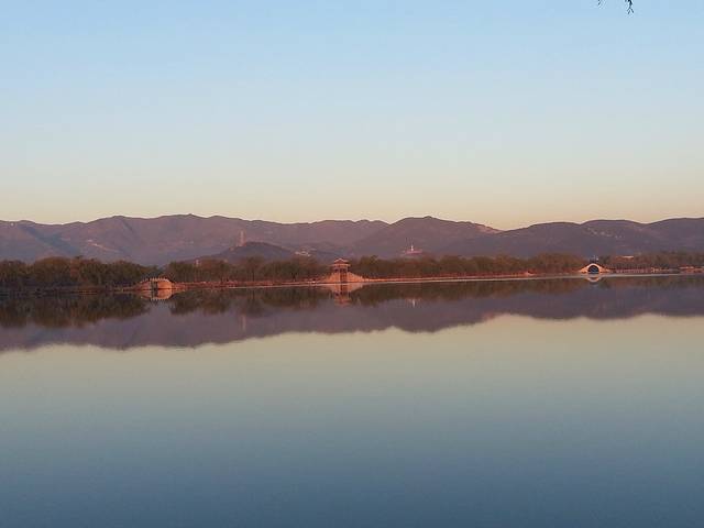 晨7时,从颐和园南如意门进入,向北沿湖边直行。从昆明湖东岸向西眺望西堤、玉泉山