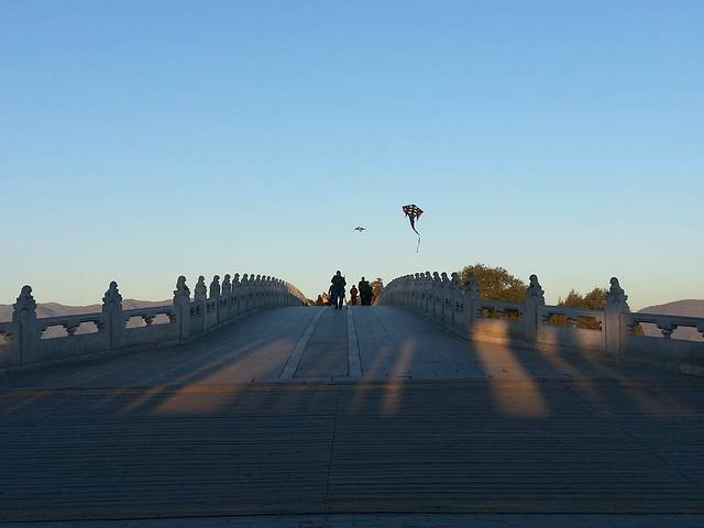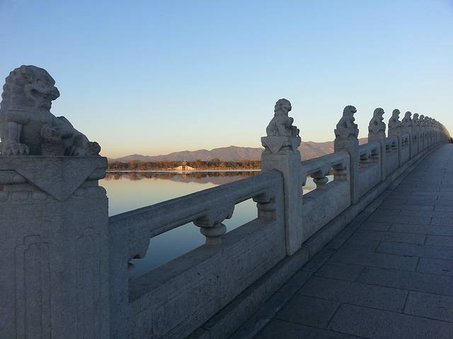 始建于清乾隆十五年(1750),全长150多米,宽8米,是我国皇家园林中现存的最长的桥,因有十七个桥券洞而得名。它西连西湖 岛,东接廊如亭,飞跨于东堤和南湖岛之间,不但是前往南湖岛的唯一通道,而且是湖区的一个重要景点。桥头及桥栏望柱上雕有大小不同、形态各异的石狮544只。比起北京 石狮子较多的卢沟桥 ,还多上59只。观赏石狮的奇趣造型,别有一番趣味。桥栏的两端有四只石雕的异兽,威猛雄健,当属清代石雕艺术品中的杰作。