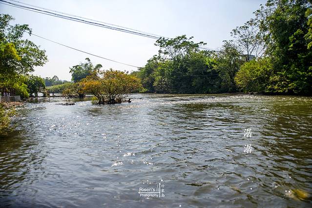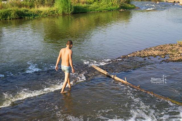 在旁边还有两个水车,典型的广西田园范。这里的围栏有个缺口,可以很容易下到河里,河水清澈透明,河边也不深,水温正合适,站在河里吹着微风好不惬意。