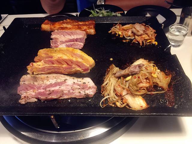 都是满座,我们等了一会,服务员就招呼我们入座了。还好菜牌有中文,还有位中国大姐服务员。我们就选了八种味道的烤肉,一份是150g一大块肉,八份装八个小碟子,还配了海鲜大酱汤。