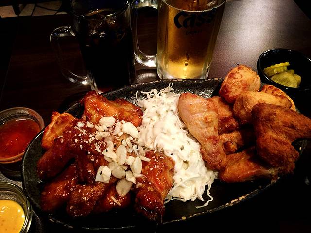 冷面消化得差不多了,我们的下一个目标是宵夜炸鸡和啤酒!本来想去支持神话代言的校村炸鸡,但是最近的店也在弘大。我们想就在明洞找一家吧。在大众点评上选了一家OPPADAK炸鸡,跟着导航找过去。到到达目的地的时候晕头了,在哪呢?韩文招牌看不懂,又出动绝招,对电话号码。原来就是我们头顶楼上三楼的这家。人家logo就是个鸟字么,我们太迟钝了。开心地上楼,发现二楼还是雪冰呢。权衡了下,肚子先留给炸鸡和啤酒吧~