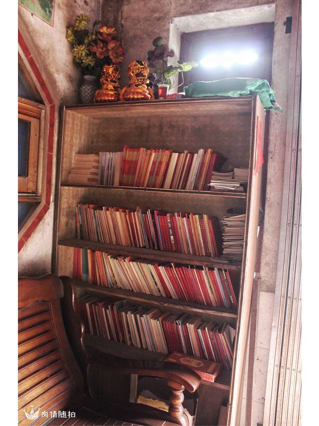 庙里有个书架,上面摆满了经书。沙发的后面的里间是解签处,守庙的老人在里头解签。很热情的叫我们喝茶。