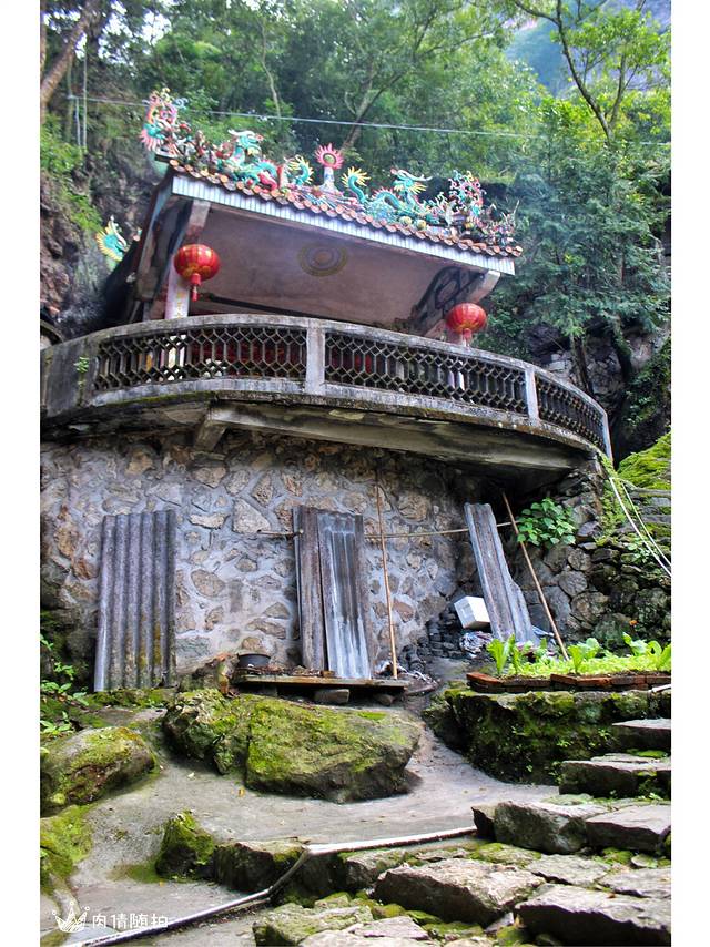 这个角度就把“悬空”这个特点明显的呈现出来。自从登入山门就开始有水从天降,想罢这一定就是“珠帘化雨“了!恰逢雨季,灵通寺前都会有这落差达300米的珠帘化雨瀑布一景,水量大的时候就有很明显的瀑布状,从灵通寺上方的崖壁飞流直下,如珠帘高挂。那平时的话就呈一道点滴如珠织成的水帘了,长年累月,给灵通寺蒙上神秘的面纱,更有朦胧感了。