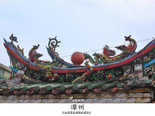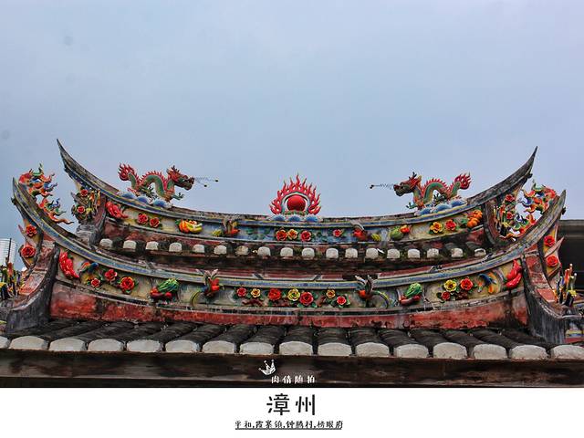屋檐上飞檐翘角有着传统闽南风格彩色琉璃的双龙戏珠彩雕。