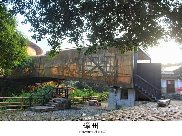 “桥上书屋”是中国清华大学建筑学院教授李晓东以及他的学生于2008-2009年在两座乾隆年间的土楼之间架起的一个书屋,也就是希望小学,造价65万元。曾在2010年获得世界六大最著名的建筑奖之一的阿迦汗建筑奖、世界新锐建筑奖第一名、全球八大环保建筑唯一上榜的中国建筑。整个作品采取钢桁架结构,没有完全被当地特有建筑风格和材料所束缚,外表面采用木条格栅,用钢龙骨固定。看起来细如线,在室内看即可遮阳通风,又可依稀一览这乡间美景,设计精致实在巧妙。