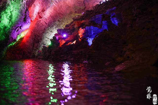 洞里有地下暗河,可以乘船十几分钟,欣赏里面的景色。洞里还有一座龙宫,是石柱石笋最聚集的地方,很漂亮。龙宫里有一根“定海神针”,一根高约20米,两端粗,中间细,最细处直径只有10厘米的钟乳石柱,据推算已生长了二十万年,景区为此投保了一亿元保险金。