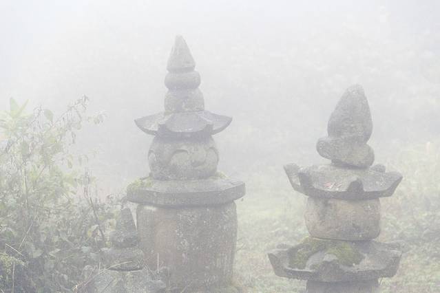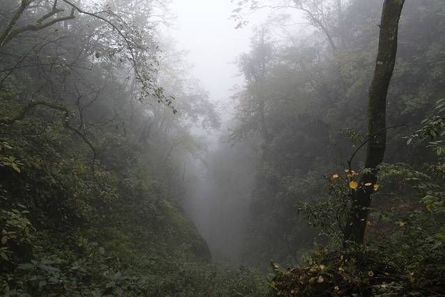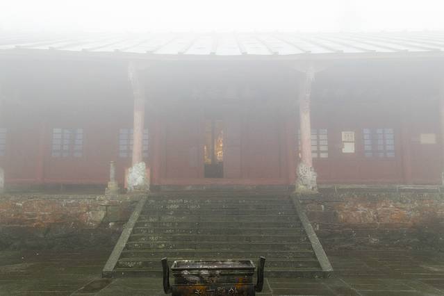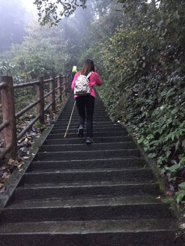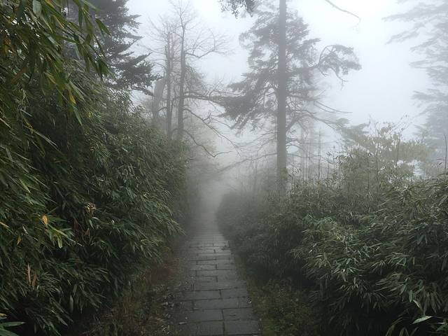 第二天徒步路线:息心所——初殿——华严顶——九岭岗——洗象池——雷洞坪——接引殿——坐索道上金顶。在息心所6点起床吃早餐天还是漆黑一片,早餐有豆浆、馒头、泡菜,因为第一天爬山消耗体力比较大原因感觉味道也不错,一连吃了三个馒头。山中雾气很重吃完早餐后等到7点才朦胧可见,我们拄着第一天在山脚老奶奶那买来的竹棍摸索着出发了。在山角买的时候只是想着老奶奶年纪大了赚钱不容易,一路下来才发现这竹棍的重要性。从息心所徒步到雷洞坪用了5个小时到达,再从雷洞坪到接引殿40分钟,到了接引殿后可选择索道或继续徒步上金顶,我们因为只计划了两天时间,所以选择了索道(来回每人120元)15分钟左右就可以到达山顶,如果徒步的话需2小时左右。第一天从清音阁到接引殿一路都是云雾层层的,能见度差,整个上山就是穿越云层的过程。