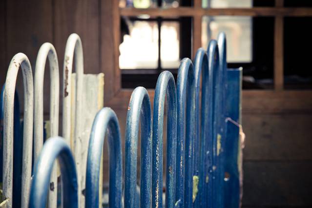 浅绿色栅栏的门口,