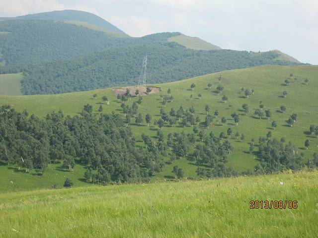 山坳里零星点缀着白桦树,远处是整片的白桦林,我们沿着马道把车开到山顶,山上风很大,冷飕飕的