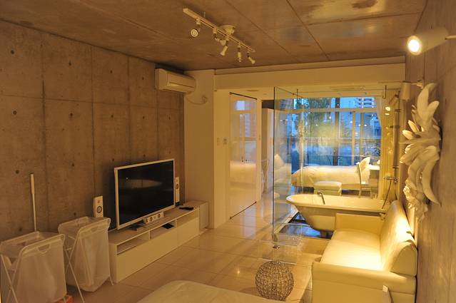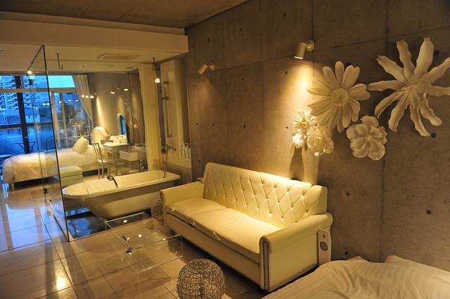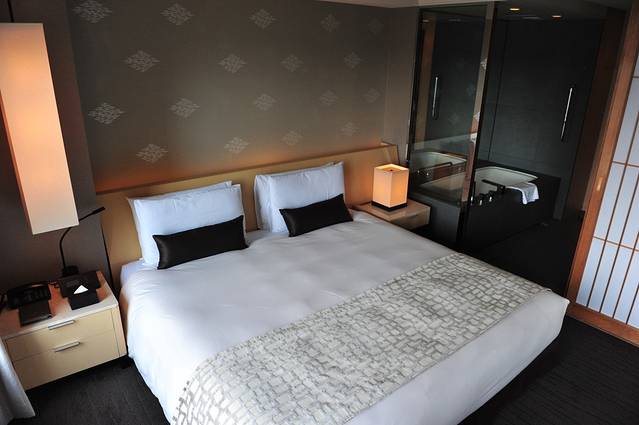 浴缸紧挨床头柜,但有个日式的推拉门可以隔断,让屋内充满视觉的变化。