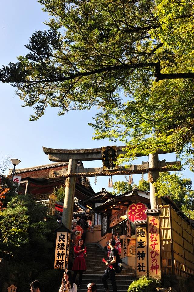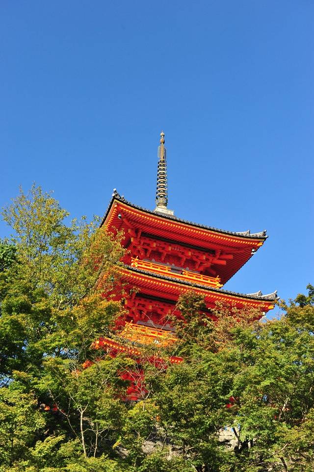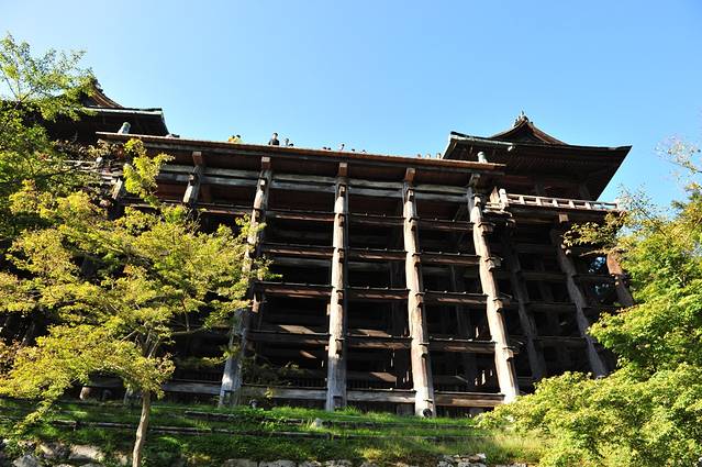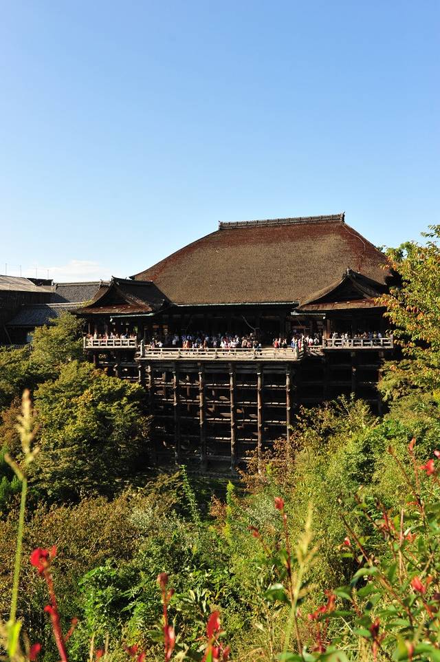 本堂前悬空的清水舞台是日本国宝级文物,四周绿树环抱,春季时樱花烂漫,是京都的赏樱名所之一,秋季时红枫飒爽,又是赏枫胜地。