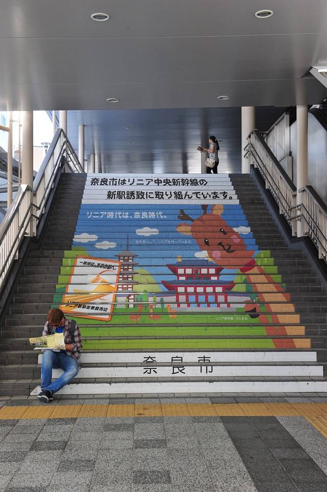 一路搭乘地铁来到奈良车站,站台里就有很Q的小鹿涂鸦了
