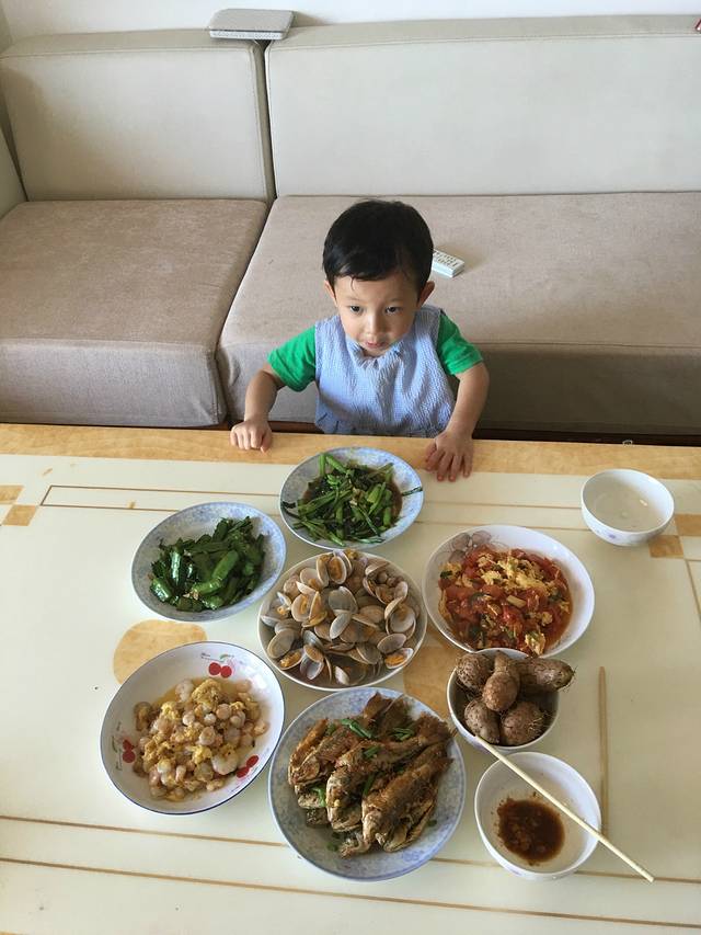 妈妈们做的午餐,虾仁、鱼、花蛤,还有南方豆角超级喜欢,芋头不错