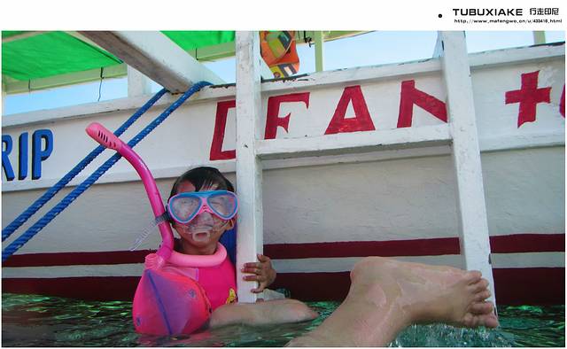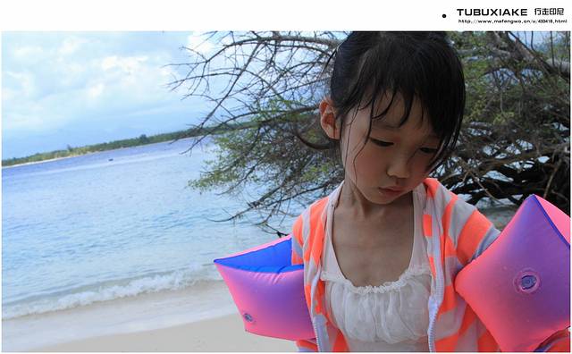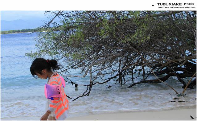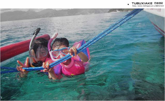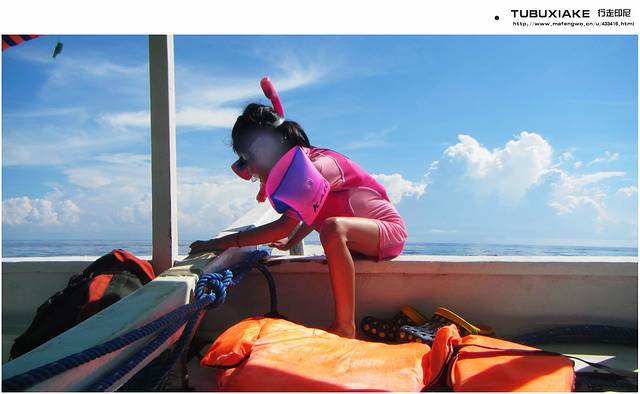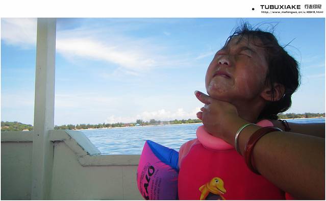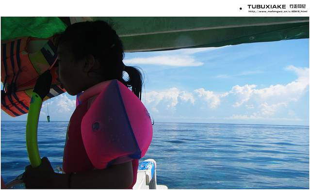 今天我们的船要在米诺岛MENO的外围一圈,再去Trawangan岛附近浮潜一阵,小姑娘一点也不惧怕大海,勇敢的自已下船,跳进大海,这种网上买的游泳服很适合小孩子们在海里浮潜,也不用担心身上为被太阳晒伤,大人们省了不少心。