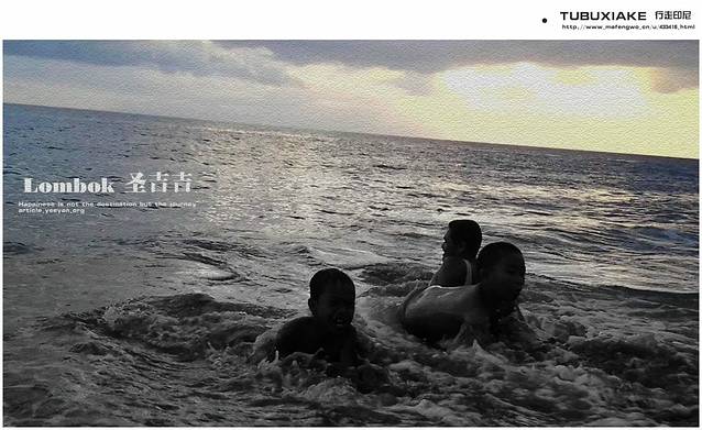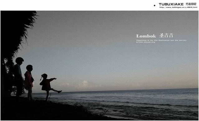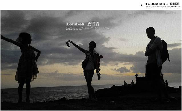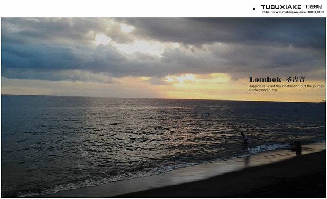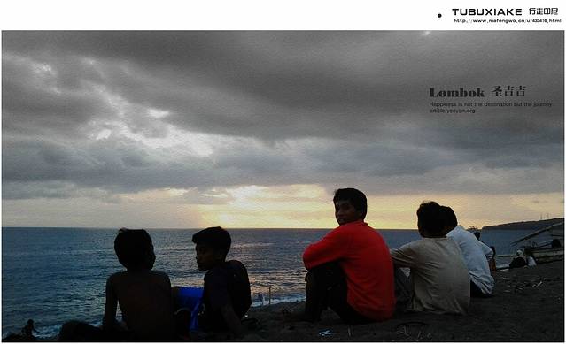 圣吉吉海滩的日落是出名的美,骑行到海边,停下车,会有人帮你看车,看车费10B,走到海边,脚踩黑色的沙滩上,有一群人在祈祷他们穿着龙目民族式的服饰,远处还有一群大孩子在热情的踢球,一群孩子坐在沙上看着踢球边欢呼