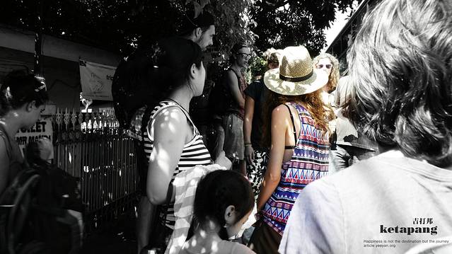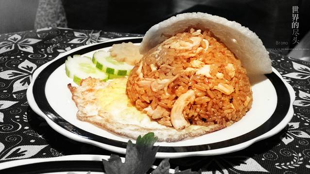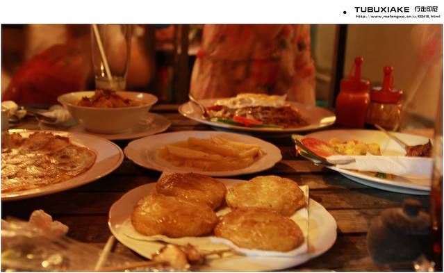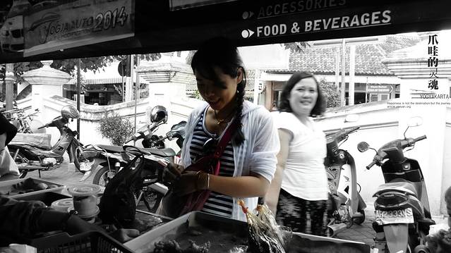 马里波罗大街,日惹最热闹的大街,它的边上是JI Sosrowijayan街,这里开着众多的廉价背包客客栈和酒店,当然高档的也不少,马里波罗大街人潮汹涌,热闹非凡,两边排满了小吃和商店,噢,这里的特色不只只有客先死,还有精致的马车,路上是摩托车,汽车,马车,客先死,流动着,我们三人找了一家很有日惹风情的穆斯林手抓饭路边摊,席地坐下。