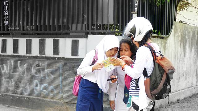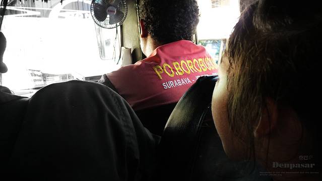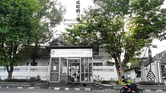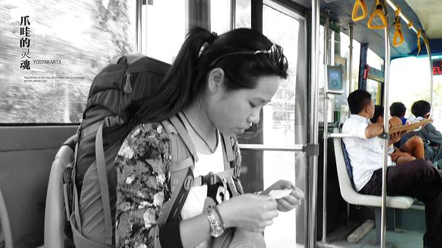出了机场外面黑压压的一片,会有人不停的问你要Taxi吗,我们笑着向他们说NO,日惹真的好热,机场很小,左拐右拐,下地下通道,三人直接在通道的警察边上换了身夏装,走出通道,左边不远处就是公交车停靠站,给工作人员看我们的地图,并指明要到的地点,他写了一张小纸条给我们,这小纸条就是我们坐公交的法宝了。