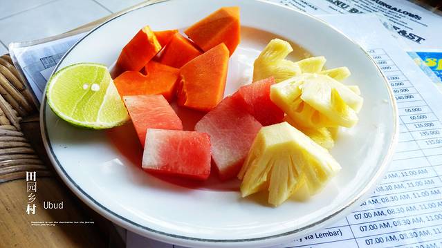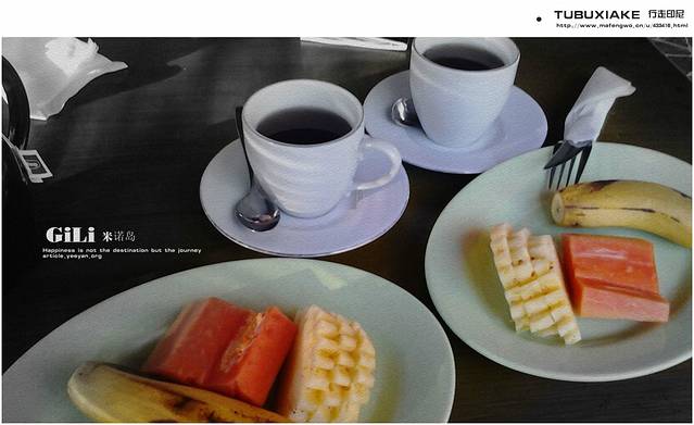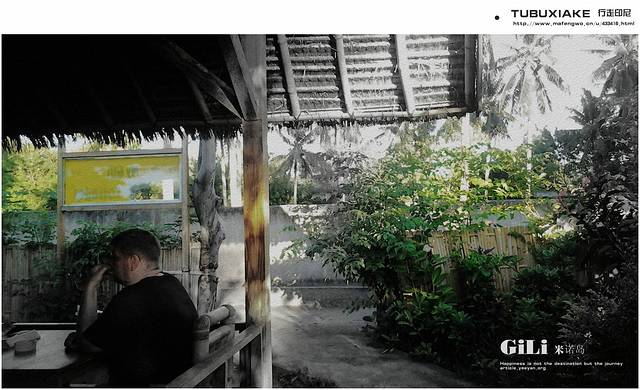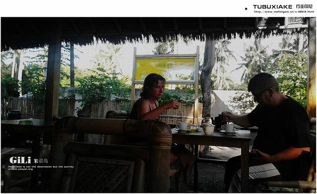 听着满岛响起来古兰经,我们起床了,整理好背包,收好晒在花园里的衣服,我们背着整理好的背包出来,坐在My Gili Cottages 餐厅,吃早餐,我们吃完马上就要赶去码头坐公交船去龙目BANGSAL,吃完水果,来不急吃炒饭了,和边桌的俄罗斯夫妇说了声bye,告别My Gili Cottages,一禾说姻旦没来送她