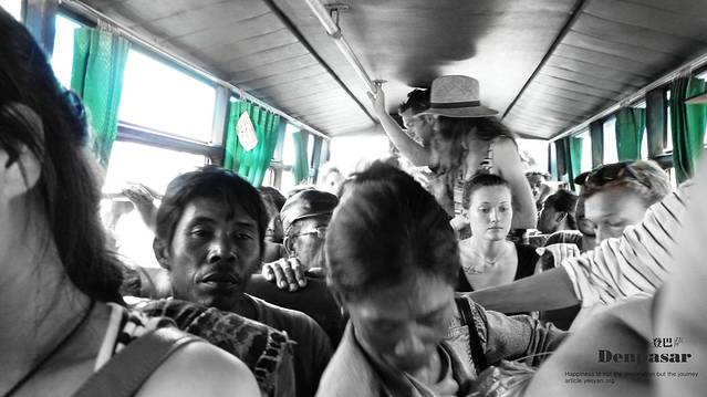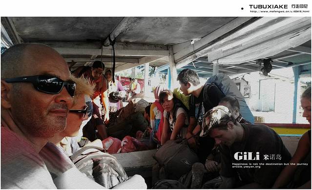 挺拥挤的公交船,没有任何救生设施,我们的脚摆放在货物上,船上一半当地居民,一半西方背包客,当然还是我们三个China,这样的条件下人与人之间特别容易拉近距离,公交船马达隆鸣,重重的货物把船身压的很低,几冬乎我们和水平面是平行的,海浪此起彼伏,我们要大概30分能到达龙目BANGSAL。