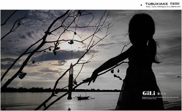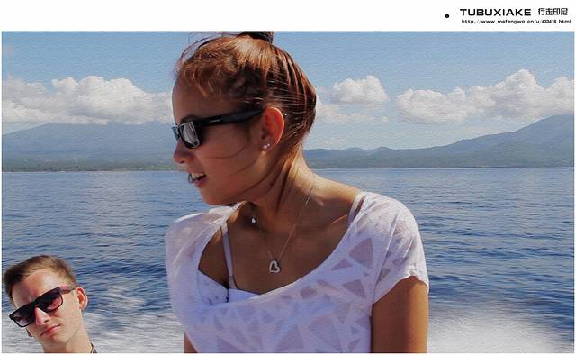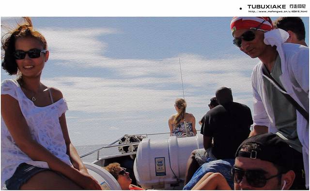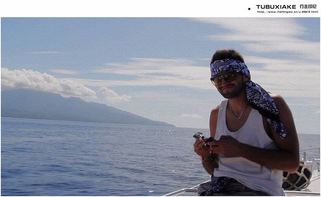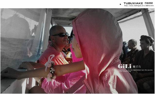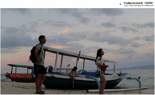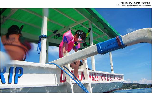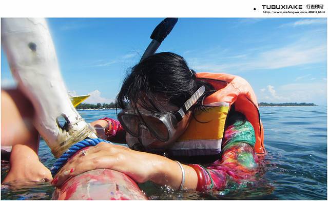 吃好早餐,我们随姻旦她爸开着螃蟹船出海,螃蟹船的正中央底下是透明玻璃做的,可以看到底下成群的鱼儿,我们自已带了浮潜工具,习惯了自已带,觉得卫生点,虽然我们的船长也给我们准备了包括脚蹼在内的浮潜三宝。吉利群岛位于龙目岛西北端,与巴厘岛之间的海域之中,由Gili Air、 Gili Meno 和Gili Trawangan组成,被誉为散落在大海中的璀璨珍珠,去过的人无一例外地对它们大加赞赏,它们美艳,而且没有任何的现代交通干扰,由于在金巴兰的相机牺牲,带来的相机套也就用不上了,可惜了这里海底的美景。
