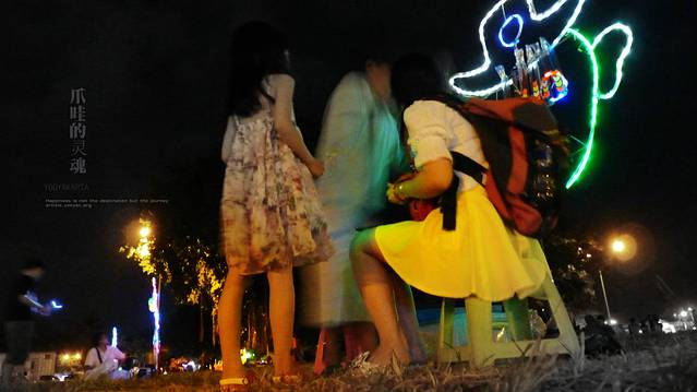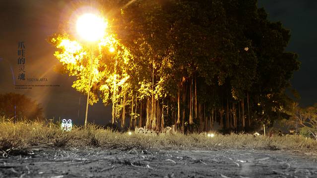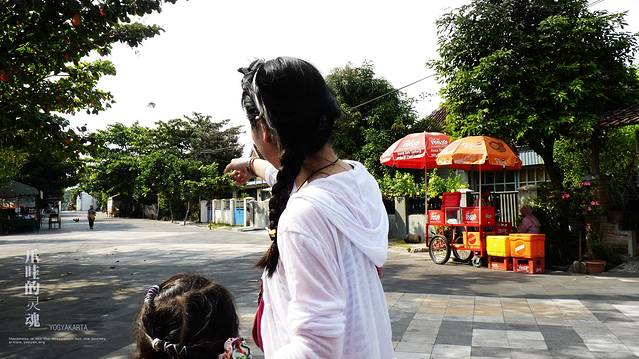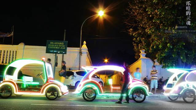 知道了马里波罗街的位置,我就能很容易的找到其他的地方,包括我们的酒店,对于日惹我还是做足了工课的,在回来的路上,经过一个类式草地和广场的结合体,一禾在草地上跟小贩买了一个小玩意,打到天上然后自由降落,象降落伞一样发着光掉下来,她玩的不亦乐乎,草地边上一圈是日惹人自创的一种发光汽车,供成人和小孩子们娱乐,广场草地中央是一棵巨大的热带老树。