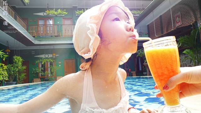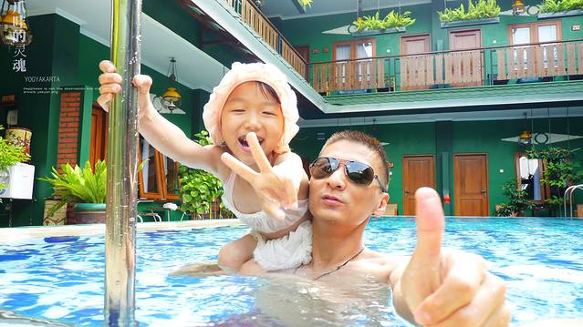 我们住在洒店二楼,风扇房每晚170K,相当于,89元人民币,酒店以绿色为主色调,浓重的印尼风。每次一禾一见游泳池就兴奋的不行,悲吹的一禾他爹,忘了带泳裤,害的一跳水屁股就露了一大截(那件裤衩,没系系的带子)。