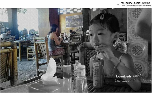 点餐是那两妞点的,我们已被刚刚的意外有点吓到了,媳妇还在不停的把一禾身上的衣服洗了,晒干,而一禾身上我们给她围上一条丝巾,这一看更象当地的土住居民了。而中午点餐就交由那两个小妞,还真点的下手,平时我们都是分开吃,这次第一次合着吃,她们竞点了1000多人民币一顿,这是穷游的节奏吗,而且东西还非常的难吃,而且她们自已身边竞没带印尼盾,唉,到最后打车到龙目机场她们竞花到没钱付车费,还有很多离奇的发生在她们身上的故事,我不想一直说她们了,败给她们了,败给她们了。