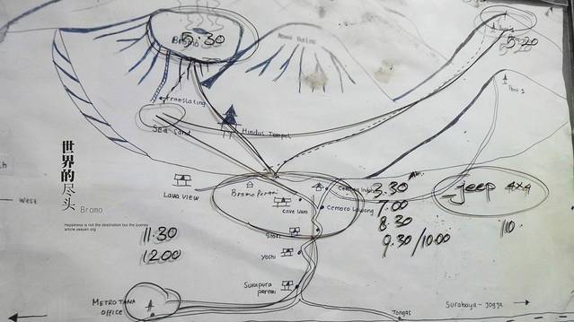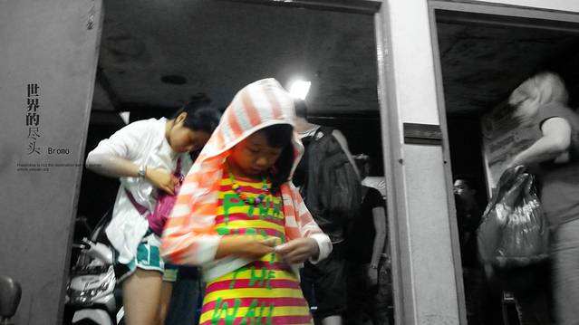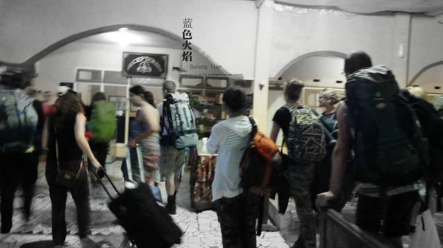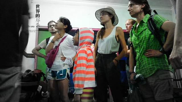 我们一车十人分别住在三个旅馆,明天凌晨3点半要准时出发,早餐由吉普车先在一个远处的观景台,就是一座小山,观看布罗莫的日出,然后,吉普会把我们送到行走的地点,让我们开始行走号称月球表面的布罗莫,9点准备下山去宜珍。好吧,我们换了一辆小巴,破旧不堪,我们主动的占了第二排的位置,第二排就是好,宽敞,小巴先停在小镇的超市前,让大家买所需的用品和食物,水,我们每人基本上都买了那种最大瓶的瓶装水,司机也是,开了一会儿,小巴轮胎漏气了,修车店修车,好累的一天呀,真是够折腾。上山的路,山路十八弯,夜很黑,雨后的山路,前面几米基本上都看不到了,雾气重重,一禾说我们要去见巫婆住的城堡吗,我说不是的,我们去冰雪女王的宫殿,夜路好黑,有点可怕,山路坡度也很大,而且时不时一个大的拐弯,这么大的雾他们是用感觉开的车吧,朝着一份秘神我们的车在迷雾中前行。约一个半小时的山路,我们终于到达我们的山顶旅馆。