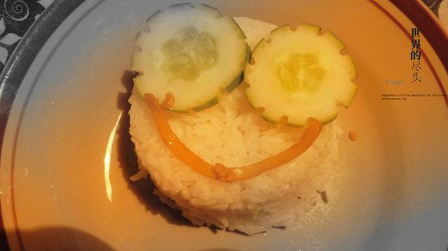 一禾在她在圆圆的白饭上放上了两片黄瓜并在下面放上了一条榨菜,成了一个笑脸。