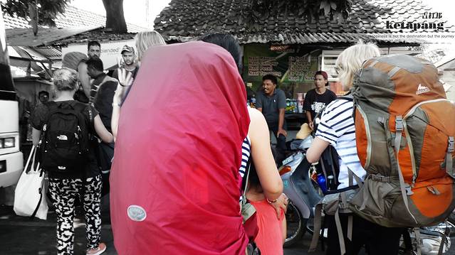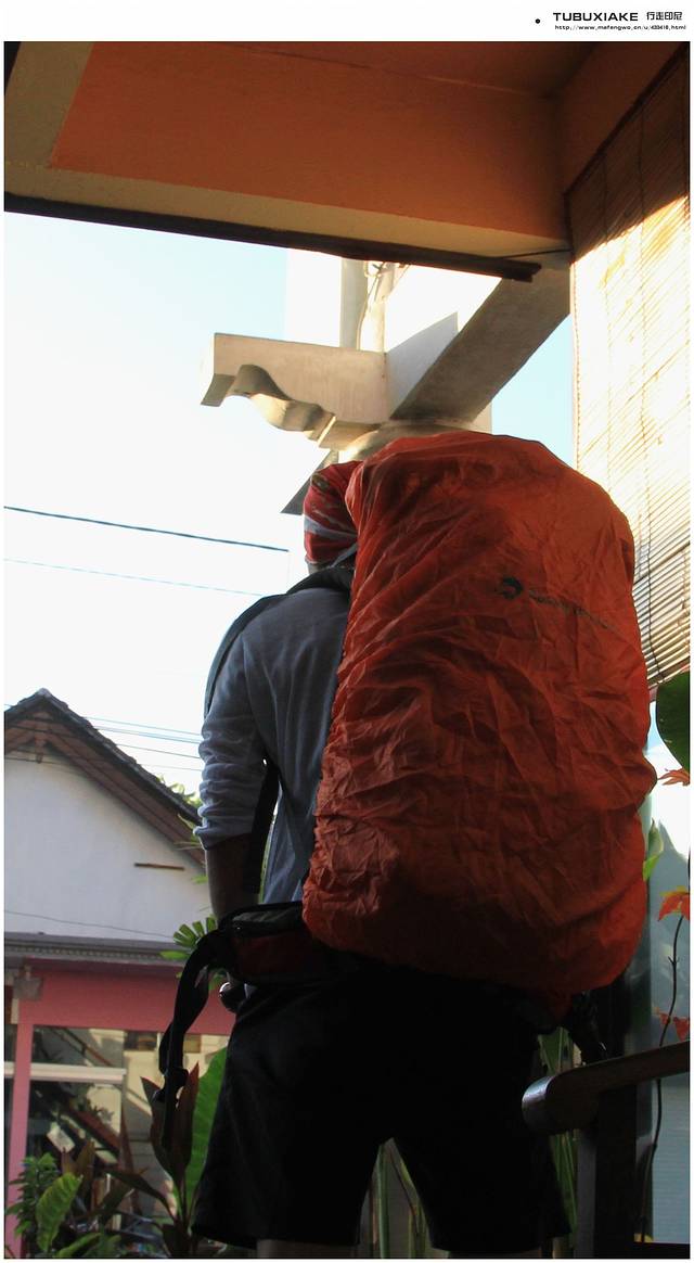风扇房有点热,一大早起来整理背包,昨晚两人懒得理,两个重装,再理出一个小背包,放水和食物,还有重要的证件,吃完酒店的早餐,三人三个背包前台办理退房,办退房时碰到一位北京来的大姐,一个人刚来正在苦恼怎么玩日惹呢,我们见意她租摩托车,但她说她不会开,那好吧,反正接我们的车还没来,我们就聊着这两天我们在日惹的一些感受。
