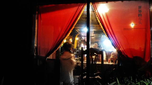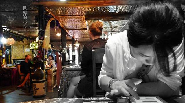 这小店,破破的,凉凉的空气,寥廖几个老外,大家安安静静坐着,老外甚至就点了一杯果汁,就在边上开着手提蹭网,蹭到半夜,我们也舍不得离开,听着看着这沙路边传来的铃声和马蹄声,那是运货物的马车,在安静的夜里象一道划破长空的轻音乐,渐渐的来,渐渐的远去,