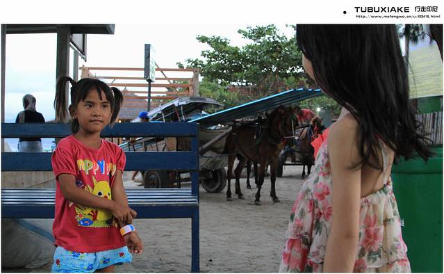 傍晚时分在码头碰到了姻旦,好象是她们家的货正在卸货,米诺岛所有岛上的一些日用品和食用,都是通过公交船从龙目岛上运过来的,而岛的交通工具是马车,通过一辆辆的马车把货物拉到她们家,所以我们时常在路上听到马车叮叮当当的声音,甚至很晚的时候也能听到,米诺岛很小,围着海滩走一圈,2到3小时。姻旦这时见到我们有点腼腆。