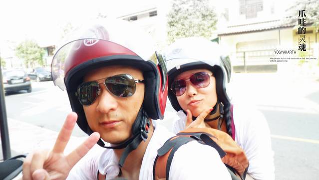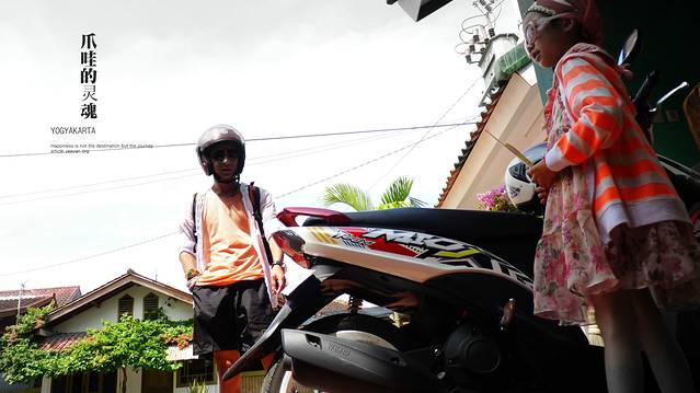 傍晚时分,媳妇和一禾穿着漂亮的裙子,俺穿了件裤衩,开着摩托奔驰在日惹街头,也许你不知道,这里不象伟大的祖国,日惹的整座城看不见什么高楼大厦,却时时刻刻散发着它独特的光采和风情,街上的主力不是汽车是摩托车,可以用一窝蜂来形容街头的摩托车,我们确实是稀有动物,人们一见我们就笑,很欢迎的那种,很开怀的那种。