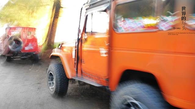 凌晨三点半,我们三点钟就起来了,我们只整整睡了不到四小时,旅馆里的冷水洗脸,冰,和媳妇穿上冲锋衣,一禾是一件破旧的羽绒和一件有点短小的裤子,因为在火山灰的地表行走,我们想她一走完这一身就可以扔了,旅馆给我们发了早餐的纸盒子,里面是一个三明治和一小份牛奶,这时我们要交布罗莫的门票,一个胖子,唉,一路上碰到胖子就没有好事,感觉好贵,去年也是一般的价,今年这么一下子这么贵了,难要我们还是来迟了吗,两人交了400K左右,坐上吉普,伴着夜色,我们车轮滚滚,火山灰尘土飞扬。
