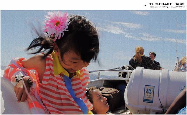 在海里浮潜,从一个点到另一个点,下一个浮潜点在不远处,我们也就不上船,直接挂在螃蟹船两侧,姻旦她爸开动螃蟹船,说实话开着船挂在螃蟹船两边,廷吃力的,这小姑娘一点也不惧怕,而且玩的很嗨噢