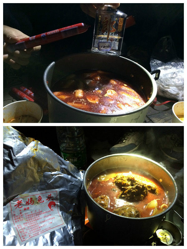 每一次出行都是对毅力的挑战,极限只有在崩溃的边缘才能突破,这次因为有3个新小伙伴走到观音岩的时候走不动了,他们的3位家属为了照顾他们也放弃了冲顶,不过某一位笑笑同学背了户外高压锅和一大包火锅,他们6个人在观音岩炖了一只鸡,也算圆满了。