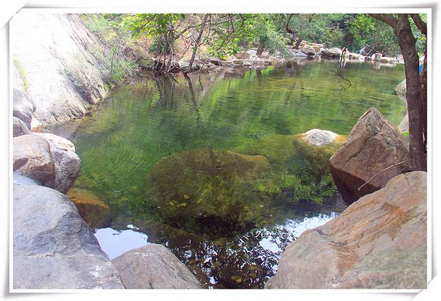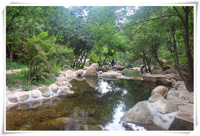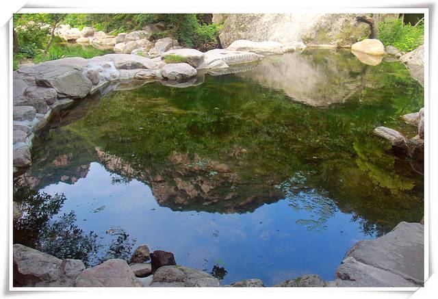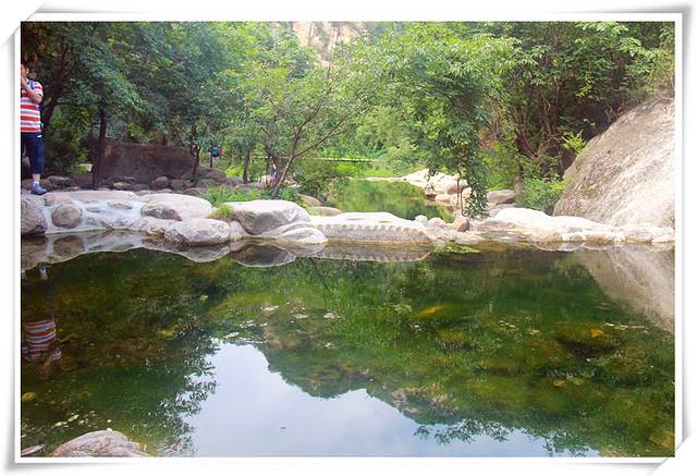 我觉得百泉山最吸引人、也最美的,就是一条汩汩流淌的溪流串联起来的无数个潭水,青山、绿树、倒影,给人以静谧闲适之美。和去年8月我们第一次游览百泉山对比,间隔尽管还不到一年,但景区的变化还是很大的,潭水的数量更多了,而且很多地方现在还在紧张的施工,师傅们在溪水流淌之处,就着地势的变化随意地进行一下拦截处理,边又形成了一个新的水潭,潭水溢流又形成了一个新的瀑布。相信再过个一年半载,百泉山的水景会更多。这些潭水虽然很多是人工改造而成的,但由于注意了因势利导,并不会让人留下太多人工斧凿的痕迹。