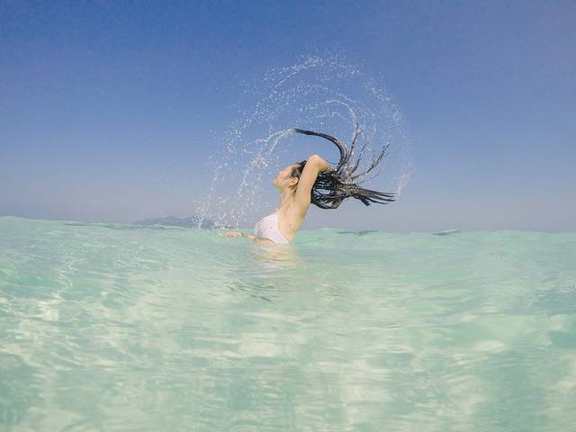 头发全湿了,怎么甩也甩不出个所以然了。不过能够看出海水的质量非常好。