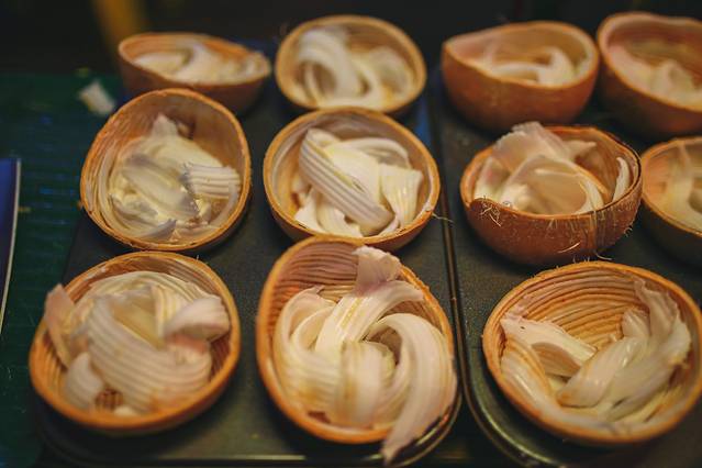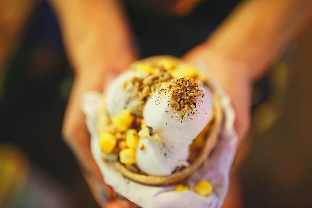椰子味的冰激凌,椰子味道很浓~上面会撒上香香脆脆的坚果碎碎和玉米。装冰激凌的小碗就是椰子壳,垫底的还有刮下来的椰肉,物尽其用哦。