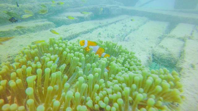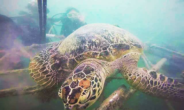 海底很多珊瑚还有几艘沉没的船只,里面住着大群的鱼很害羞,还有一只大海龟。潜水教练一直把我往海龟身上推,我不敢坚决的不敢,海龟太大了,后来上岸后教练拿我怕海龟这个事耻笑我。