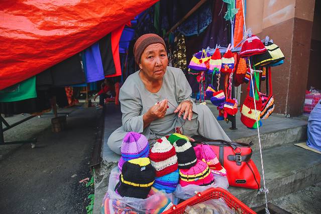 勾毛线帽子的婆婆,天太热了~不知道她勾的毛线帽帽有人买吗?