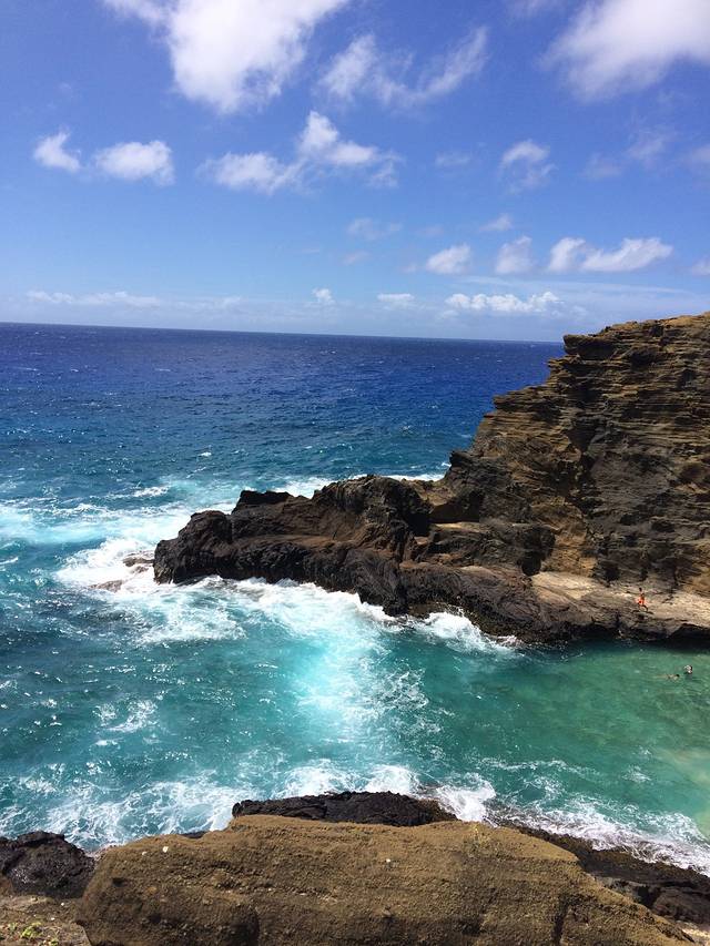 夏威夷群岛形成初期,火山爆发时将岩石高高抛入天空,落下时砸出一个个完整的圆形。由于慢慢被大海侵蚀,恐龙湾这个火山遗迹变成了一个水色湛蓝,风景迷人的海湾。因海湾几乎形成了圆形,远看像是一只正趴著熟睡的恐龙,因而被称作“恐龙湾”。