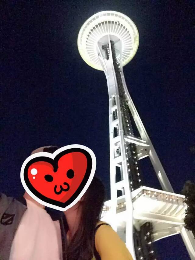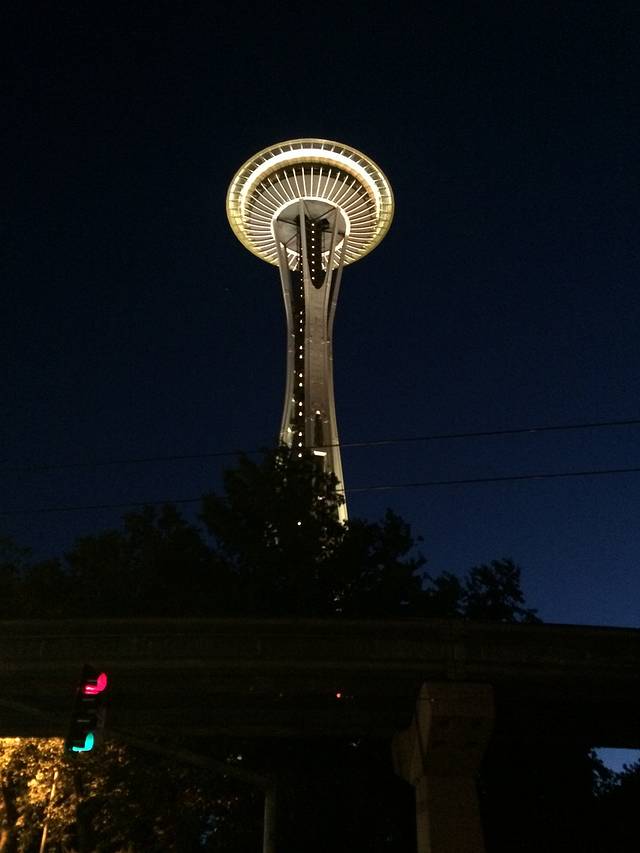 吃完晚饭就是闲逛的散步时间啦!多么养生哈哈! 我和饼哥都觉得西雅图真的是一个适合长期居住的城市,并不像人们说的天天下雨 (看来每次来都运气好),温度适宜,城市安全集中。由于我们酒店离太空针塔很近,所以不知不觉就散步到了太空塔底下,饼哥说就算不能在这上面吃饭,也要上去观光层看看。还好太空针塔营业时间比较久,我们赶上倒数第二班11点的电梯,他们的营业方式是每半小时会开放一次以便于控制人流量,还是比较科学的。