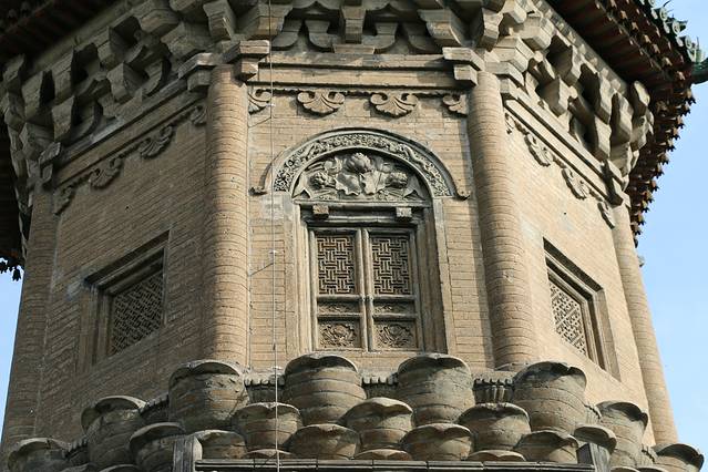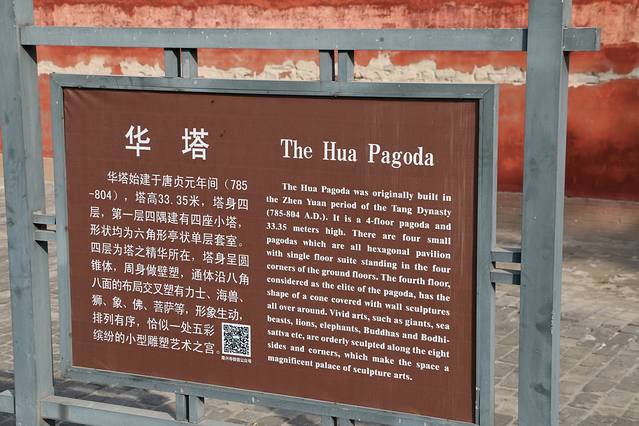 继续前行,来到广惠寺。据光绪元年《正定县志》载,该寺建于康德宗贞元年间(公元785—805年),宋金时期大修,明代中期曾予以修葺。清代后期,寺院废毁,唯塔尚存。由于史料的不足,一直以来,文物界根据塔的结构形式和第一层内壁上正隆六年(1161年)墨迹推断,该塔为辽金时代遗物。但1997年,国家文物局再次对花塔进行维修的时候,于二层佛龛壁上发现了北宋太平兴国二年的题记,由此足可证明,此华塔为宋代遗存。今天只有华塔耸立,寺院早已不存。华塔由主塔和附属小塔构成,全用砖砌。主塔底层四隅各附建一座扇六角形亭状小塔,小塔环抱主塔,高低错落,主次相依,精巧华丽,壮观秀逸。主塔是一座楼阁式建筑,通高31.5米,共分四层,各层檐下均配置华丽的砖仿木构斗拱。一至三层平面作八角形,底层中部砖制斗拱,北侧辟一券门。二三层均设平座。除各正面辟拱形券门外,还在各侧面雕以斜棂假窗、方形佛龛。第三层平座甚大,而塔身显著缩小,檐上拐角处均雕力士像,以承托塔身的第四层。第四层平面略呈圆形,外观如同一圆锥体。这是塔的主要部分,也是塔的精华所在,其高度约占全塔通高的三分之一。圆锥体内檐塔室供奉两尊石佛,外檐以八面八角垂线为中心,交错彩塑菩萨、力士、禽兽、狮、象以及楼台亭阁等形象,题材广泛、构图新颖、排列有序、做工精巧。其中,尤以动物造型最为逼真,凶猛的狮子、傈悍的大象、欲跃的青蛙,无不生动传神,活灵活现。第四层周身如同一组雕塑艺术群,五光十色、光绝夺目。该层上端以砖刻制斗拱橡子、披子,上覆八角亭式塔檐,再上则冠以八角攒尖形塔刹。塔身一至三层设置阶梯,酷暑季节,游人登临第三层平座,顿觉凉风习习。清乾隆帝曾先后两次来此拈香礼佛,临塔观景,并乘兴挥毫,题额作诗。广惠寺华塔因其上半部装饰巨大的彩色壁塑,造型古朴而雄奇,华丽而生动,不仅是我国华塔中最优美的代表,也是我国砖塔中造型最为奇异、装饰最为华丽的塔。可以毫不夸张地说,华塔是我国绝无仅有的稀世珍宝。广惠寺门票15元每位,有点贵……