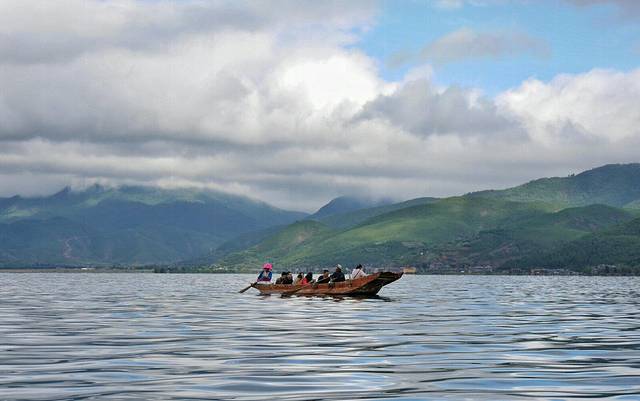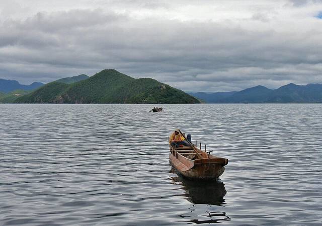 进入整个泸沽湖景区需要在入口处缴费。大落水是进入后最先抵达的一站,当地摩梭人经营着游船业务,船工小伙穿着民族服装互相调侃着划船,似乎也不太在意游客。船上可以环顾湖面,还可以上小岛遥望大落水。