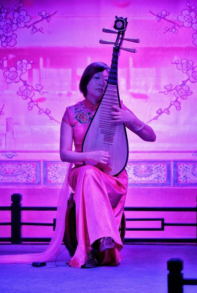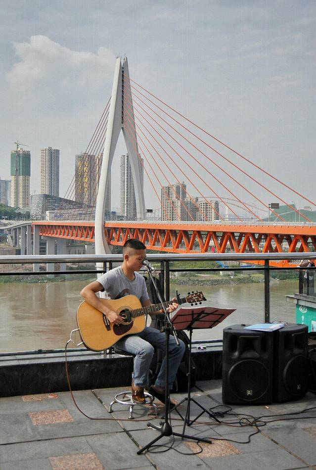 小哥占了洪崖洞楼顶入口的一块宝地,是不是来一曲“千厮桥南”。