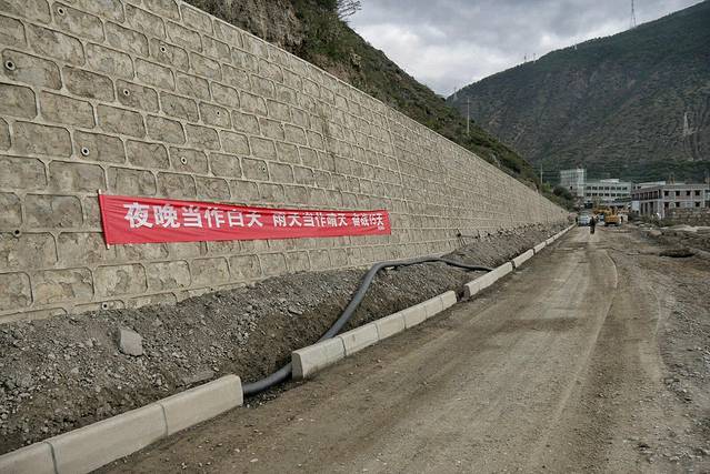 国庆将至,道路的修缮还没完成,于是乎这种狠话标语出来了。